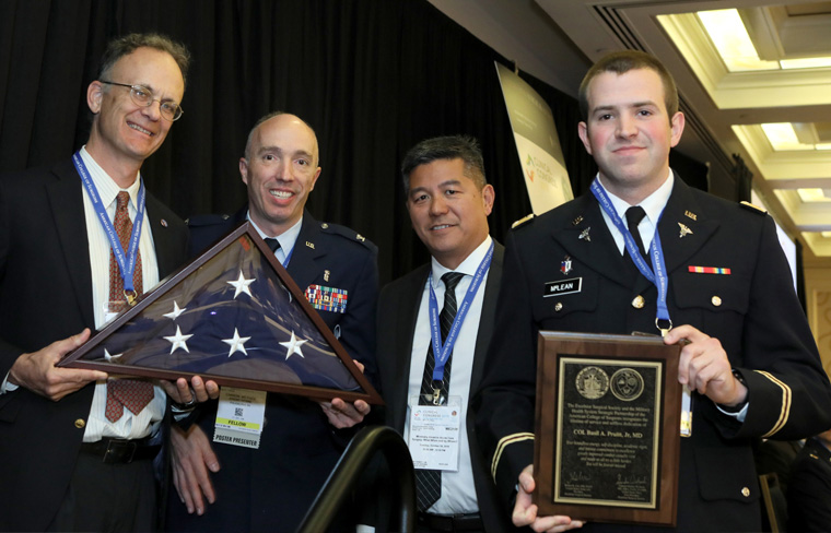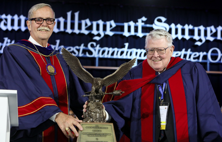 David Zonies, MD, MPH; Jeremy W. Cannon, MD, FACS, Colonel, Medical Corps, AFRC; COL (Ret.) Robert B. Lim, MD, FACS; and 2LT Theodore McLean hold a plaque and flag honoring Basil A. Pruitt, Jr., MD, FACS, at the annual Excelsior Surgical Society meeting.Outgoing ACS President Ronald V. Maier, MD, FACS, FRSEd(Hon), FCSHK(Hon), FCCS(Hon), presents the Dr. Mary Edwards Walker Inspiring Women in Surgery Award to Vice-Admiral Raquel Bono, MD, FACS. Danielle Saunders Walsh, MD, FACS, FAAP, receives the RAS-ACS Outstanding Mentor of the Year Award from Outgoing ACS President Ronald V. Maier, MD, FACS, FRSEd(Hon), FCSHK(Hon), FCCS(Hon).Patricia J. Numann, MD, FACS, receives the ACS Lifetime Achievement Award from Outgoing ACS President Ronald V. Maier, MD, FACS, FRSEd(Hon), FCSHK(Hon), FCCS(Hon). Colonel Norman M. Rich, MD, FACS, receives the inaugural Distinguished Lifetime Military Contribution Award from Outgoing ACS President Ronald V. Maier, MD, FACS, FRSEd(Hon), FCSHK(Hon), FCCS(Hon). Members of the Board of Regents (B/R), American College of Surgeons (ACS) Officers, Past-Presidents, and the Board of Governors (B/G) Executive Committee gathered Saturday for their annual meeting. Attendees pictured are identified with their titles as of Saturday