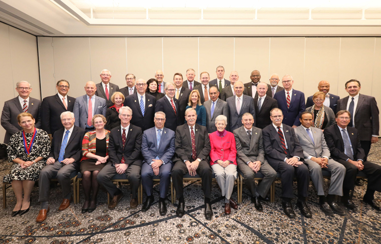 (front row, center), are (front row, from left): John L. Cameron; W. Gerald Austen; Kathryn D. Anderson; and Barbara Lee Bass. Back row: Ronald V. Maier; Gerald B. Healy; Patricia J. Numann; R. Scott Jones; and Andrew L. Warshaw (all MD, FACS).ACS Officers gathered Tuesday. From left (all MD, FACS): ACS Executive Director David B. Hoyt; President Valerie W. Rusch; 2019 Distinguished Service Award recipient R. Phillip Burns; and Immediate Past-President Ronald V. Maier.