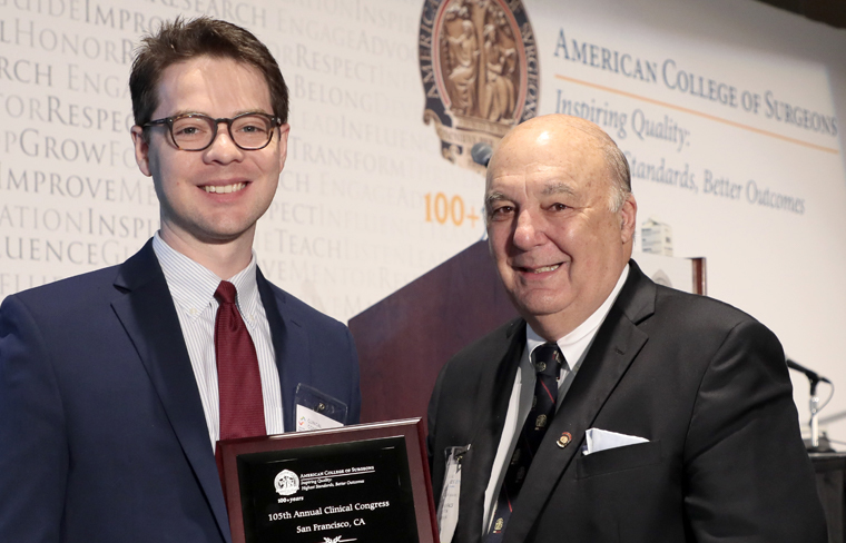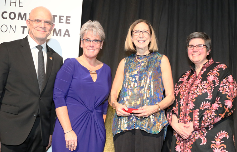 At the ACS Committee on Trauma (COT) dinner Monday, Richard J. Fantus, MD, FACS, was presented with a Special Recognition Award for his distinguished service to the ACS COT. Dr. Fantus authored 200 consecutive monthly installments of his Bulletin column, “NTDB data points,” from 2003 to 2019. Dr. Fantus is pictured with Avery B. Nathens, MD, PhD, FACS, Medical Director, ACS Trauma Quality Improvement Program.The 2019 National Safety Council (NSC) Award for Service to Safety was awarded to Mary E. Fallat, MD, FACS (second from right), at the Committee on Trauma dinner Monday. Dr. Fallat was honored “for her tireless advocacy for improving the care of pediatric trauma patients through recognition of the impact of disparities on pediatric trauma patients, and her dedication to research in trauma care.” Dr. Fallat is pictured with, from left, David A. Spain, MD, FACS, American Association for the Surgery of Trauma President; Kelly Nantel, vice-president, communications and advocacy, NSC representative; and Eileen Metzger Bulger, MD, FACS, Chair, ACS Committee on Trauma.Practicing surgeons, residents, and medical students were recognized at Clinical Congress 2019 for their contributions to advancing the art and science of surgery. Recipients honored with the 2019 Owen H. Wangensteen Scientific Forum Excellence in Research Awards included the following:
