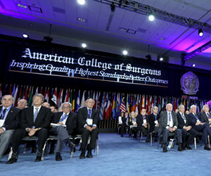 Above: Mary H. McGrath, MD, MPH, FACS, Chair of the Board of Directors of the ACS Fellows Leadership Society (FLS) spoke at the 31st Annual Donor Recognition Luncheon of the FLS. Dr. McGrath told attendees, “Because of you, over $2 million in funding and awards were dispensed during the last fiscal year.” This year’s Guest Speaker was ACS Regent and Program Committee Chair Henri R. Ford, MD, MHA, FACS, FAAP, FRCSEng(Hon).Dr. McGrath presented the Distinguished Philanthropist Award to Christopher C. Payne, MD, FACS, Monday at the ACS Foundation Donor Recognition Luncheon.Left: Eileen M. Bulger, MD, FACS, Chair of the ACS Committee on Trauma, presented the Scudder Orator certificate to this year’s lecturer, M. Margaret Knudson, MD, FACS (right), medical director and professor of surgery, University of California, San Francisco, on Tuesday afternoon. Dr. Knudson’s presentation, A Perfect Storm, focused on the ACS partnership with the military health system.The Second-Place winners of the History of Surgery Poster Competition were John Ehrhardt, Jr., and J. Patrick O’Leary, MD, FACS, of FIU Herbert Wertheim College of Medicine, Miami, FL. Mr. Ehrhardt (left) accepted the award from Richard Lynn, MD, FACS, for the poster, “Surgeons in the Colonial Development of America’s Oldest City, St. Augustine, Florida.”The First-Place winners of the History of Surgery Poster Competition are pictured with Richard Lynn, MD, FACS (second from left), of the American College of Surgeons (ACS) Surgical History Group, which sponsored the poster session. Left to right: Tom Liu; Katherine Howe, MD; and Michael Nussbaum, MD, FACS, all from Virginia Tech Carilion School of Medicine, Roanoke, VA. The winning poster was titled, “A Long Way to Washington: Establishing Surgical Care for Black Appalachians in the Early 20th Century.”The International Guest Scholars and Travelers met with members of the International Relations Committee and posed for group photos Tuesday afternoon.